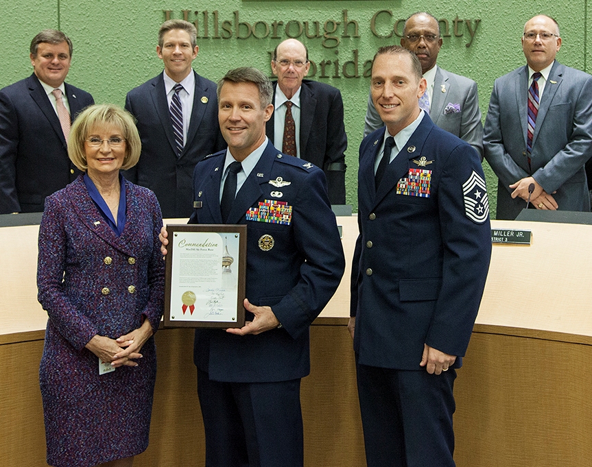 Commissioner Sandy Murman honors MacDill Air Force Base for its 75th Anniversary at a BOCC meeting. On hand for the presentation were Col. Dan Tulley, who commands the 6th Air Mobility Wing at MacDill and Command Chief Matthew Lussen.
