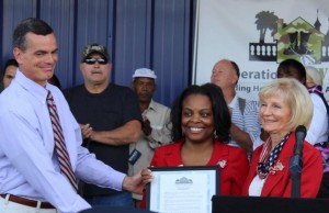 Commissioner Sandy Murman and Commissioner Mark Sharpe present Tampa Hillsborough Homeless Initiative CEO, Antoinette Triplett with a proclamation designating November as Homeless Awareness Month during Operation Reveille, which housed 70 homeless veterans in one day.