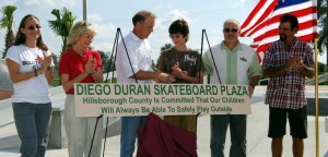 Sandy helps dedicate the Diego Duran Skateboard Plaza at Apollo Beach with Diego’s family and other county staff