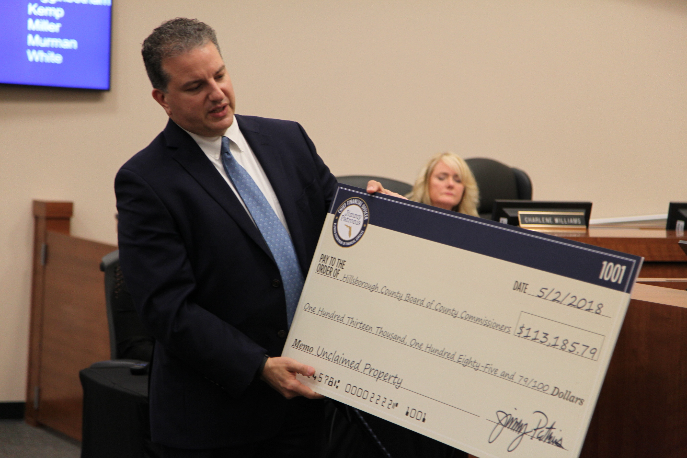 On behalf of Hillsborough County, Commissioner Sandy Murman and County Administrator Mike Merrill accept a check for $113,185.79 from State of Florida Chief Financial Officer Jimmy Patronis. The funds are from the State’s Unclaimed Property Fund and are sourced from a variety of accounts in the county’s name.