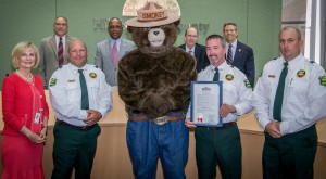 Sandy proclaims “Smokey Bear Day” in Hillsborough County, celebrating Smokey’s 70th birthday, and encouraging citizens to be careful when using fire in rural areas. From left are: Commissioner Murman, John Dewolf of the Florida Forest Service, Smokey Bear, Pat Keogh of the FFS, and Mike Facente, Forest Ranger for the FFS.