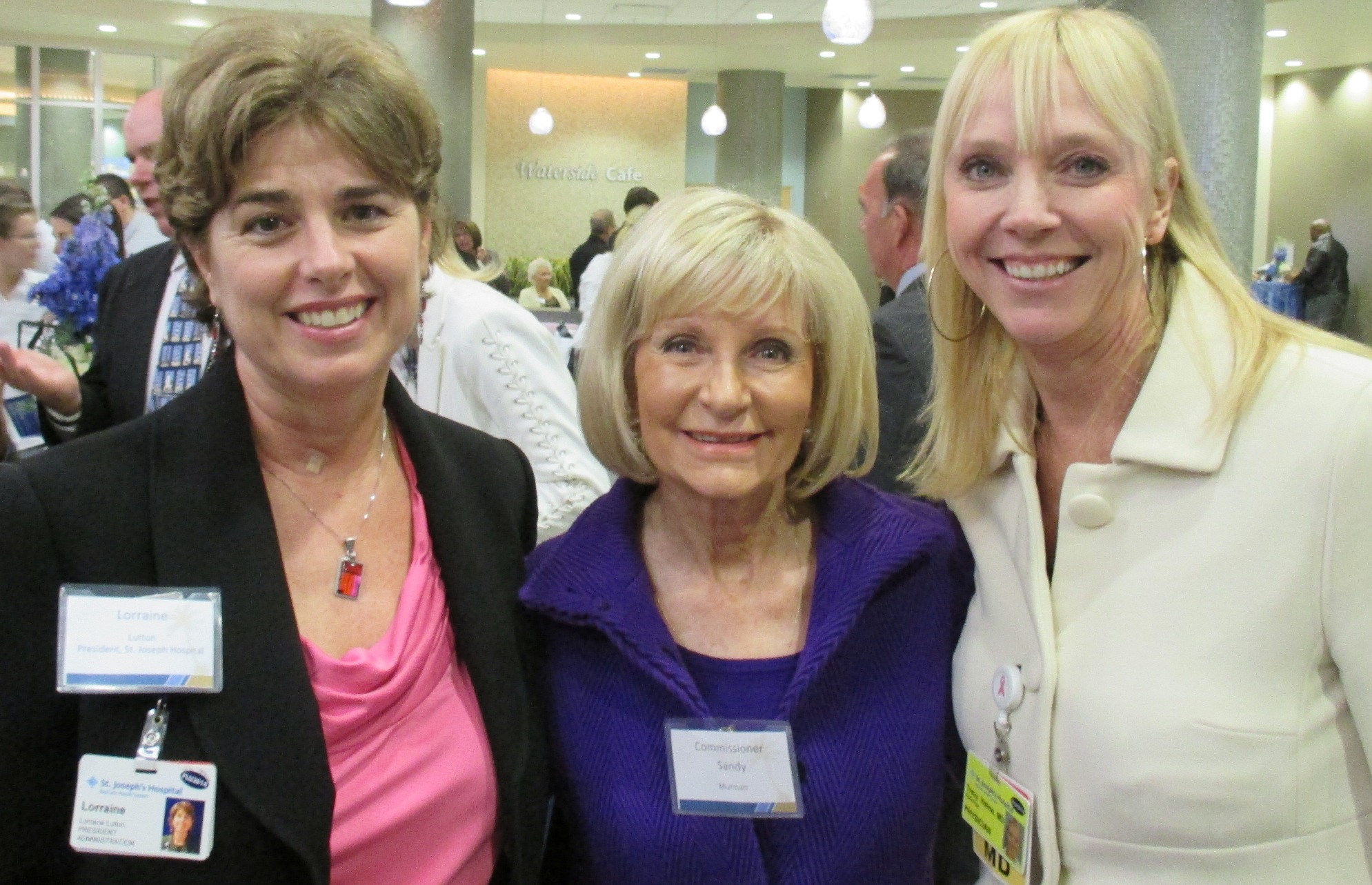 Sandy visits with St. Joseph’s Hospital South President Lorraine Lutton and Dr. Tracy Halme at a preview of its new facility.