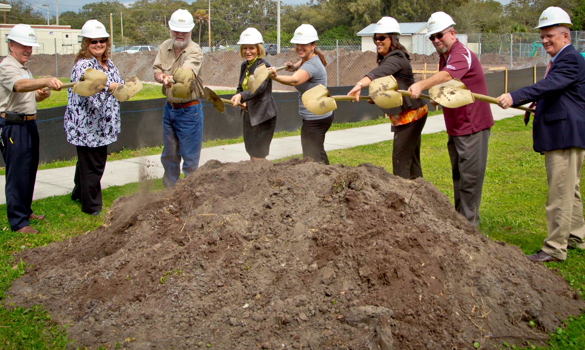 County and community representatives break ground Feb. 24 for a new, 9,500-square-foot gymnasium to be built at the Gardenville Recreation Center in Gibsonton. From left are Joe Eletto and Tanya Doran of the Greater Riverview Chamber of Commerce; community activist Pete Johnson; Hillsborough County Commissioner Sandra Murman; Melanie Morrison of the SouthShore Chamber of Commerce; and Sharon Subadan, Dave Ramirez and Jack Carlisle of Hillsborough County Parks, Recreation and Conservation. LOIS KINDLE/STAFF