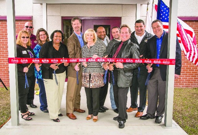Sandy helps community leaders and county staff cut the ribbon for the new Gardenville Gymnasium in South County. From left are: Tanya Duran, David Ramirez, Jennifer Caskey, Carol Johns, Greg Horwedel, Dexter Barge, Steve Alvarez, Lee Stevens, Rick Valdez and Forest Turbiville.