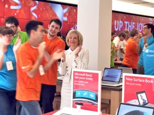 Sandy applauds Microsoft employees during the opening of its new store at International Mall.