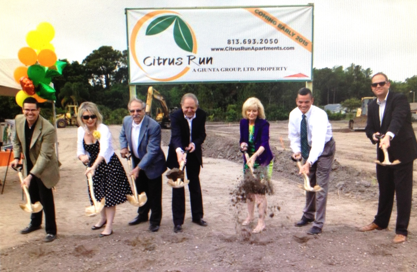 Sandy helps break ground for The Giunta Group’s latest project, Citrus Run Apartments on West Waters Avenue. From left are Paul Bauman, Gloria Giunta, Richard Giunta, Sam Ellison, Commissioner Mark Sharpe and Casey Ellison.