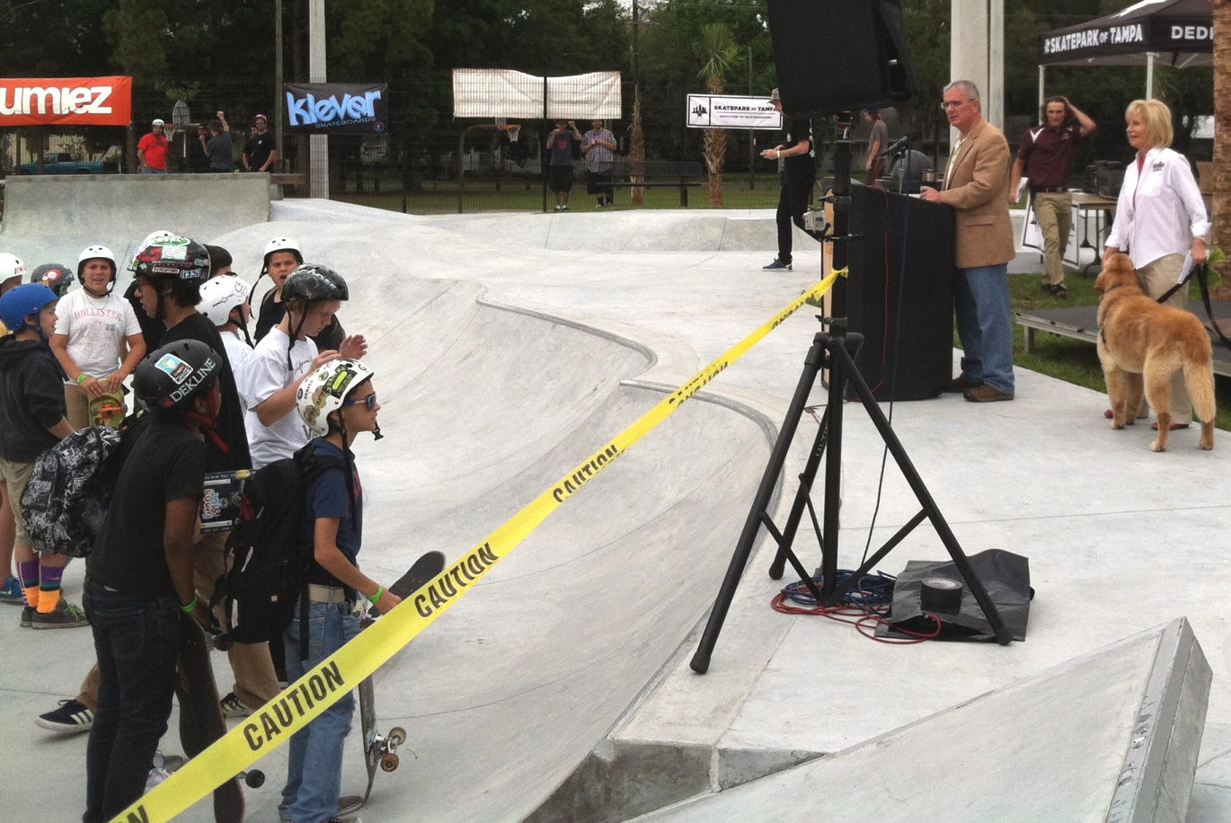 Sandy and Rocky listen to Hillsborough County Parks and Recreation Director Jack Carlisle as he speaks to skateboarders at the new Northwest Skate Park at Jackson Springs.