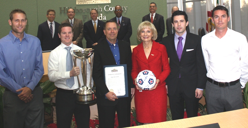 Sandy honors the Tampa Bay Rowdies for its second NASL Soccer Bowl Championship; On hand were owners David Laxer, Andrew Nestor and players Keith Savage, Mike Ambersley, Stuart Campbell and the 2012 Soccer Bowl Trophy
