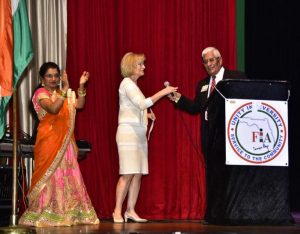 Sandy spoke to a crowd of 1,000 at the India Independence Day event with Satish K. Sharma, president of the FIA.
