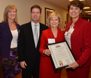 Sandy recognized the grand re-opening of the St. Joseph’s Hospital’s Heart Institute. From left are Kim Guy, President of St. Joseph’s Children’s Hospital, Dr. Andrew Sherman, cardiovascular physician, and Lorraine Lutton, President of St. Joseph’s Hospital.