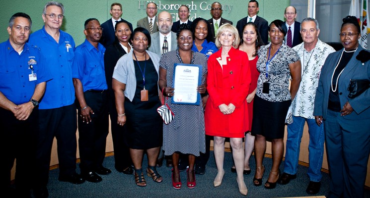 The full staff for Hillsborough County’s Sunshine Line program and Director Ed Wisniewski stand with Sandy after receiving a commendation for stellar work while serving as the transportation system for the disadvantaged in the County.