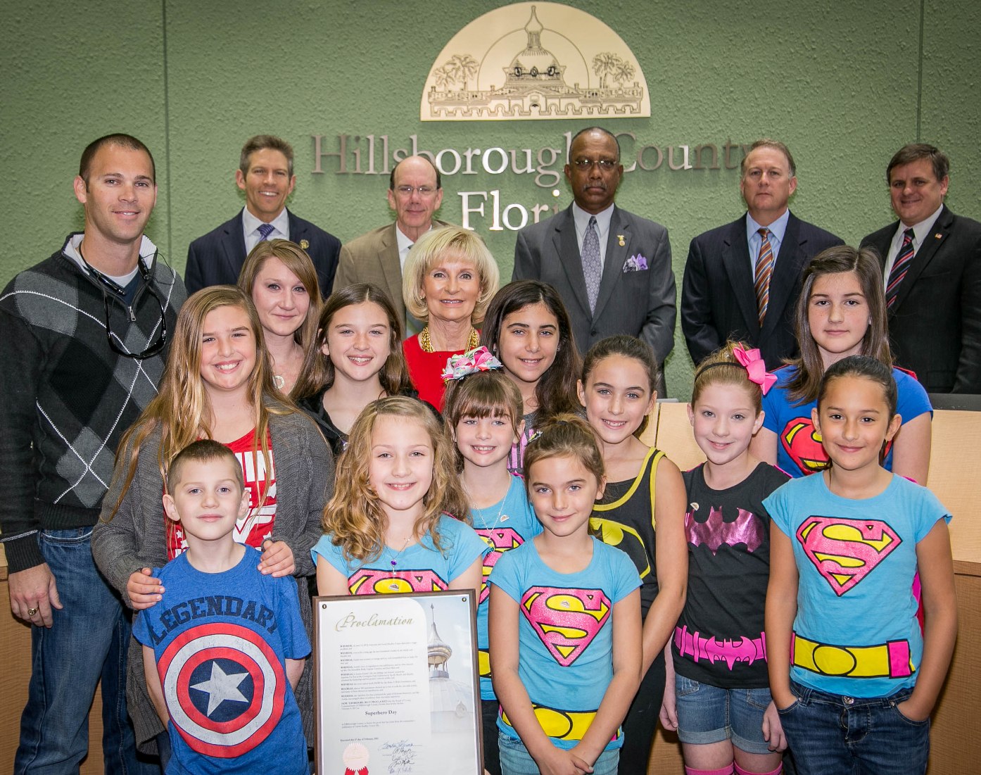 Commissioner Sandy Murman proclaimed February 4th as Superhero Day in Hillsborough County to honor the life of Austin Bradley Coates. On hand were Maria and Brad Coates, April, Aubrie and Brogan Coates, Melanie Morrison, Kate, Roxy and Ginger Morrison, and Leilani Warbritton with Kennedy, Hunter and Jansen Warbritton.