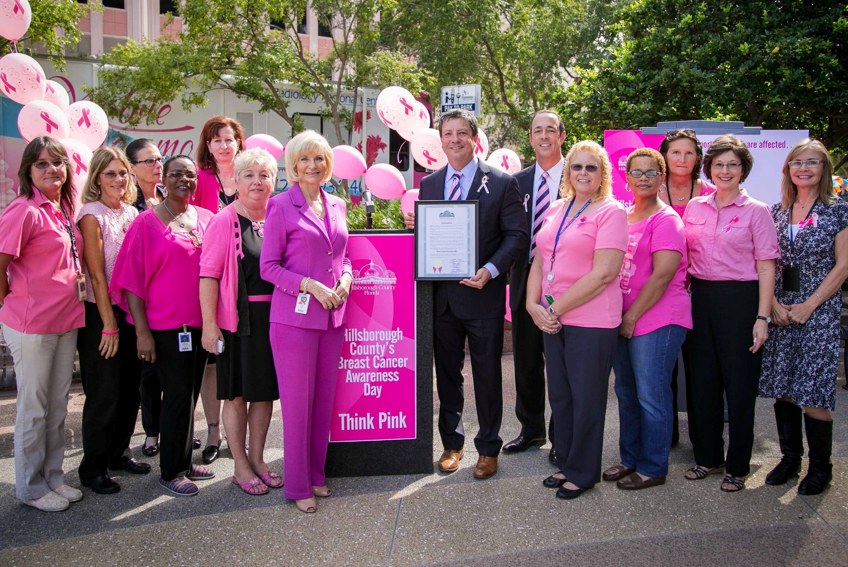 Commissioner Sandy Murman stands with breast cancer survivors during a special ceremony she hosted for Breast Cancer Awareness Day at Hillsborough County Center.